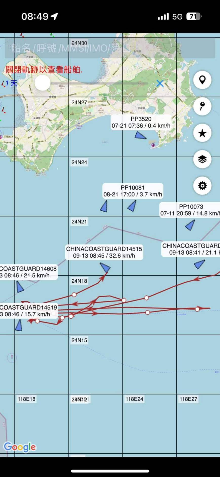 9月13日8時許,金馬澎分署監偵金門南面海域4艘中國海警船接近我國限制水域,金馬澎分署立即調度4艘巡防艇7級風浪對應驅離。