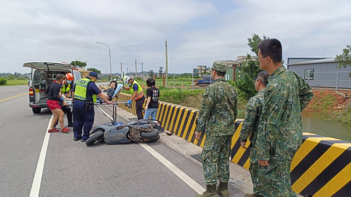 金寧鄉金門大橋近湖下端路段,於(10)日14時30分許發生一起交通事故,金城分局獲報後趕赴現場處理,經查係由唐姓男子騎乘一輛普重機車沿金門大橋往湖下端方向行駛,因操作不當自撞路緣石,發生自摔交通事故,事故發生當下有兩位金防部烈嶼守備大隊國軍弟兄於事發當時,行經該段時發現機車事故,隨即下車救援並維持交通秩序,避免二次車禍發生,,充分展現軍愛民精神。於現場協助交通疏導,唐姓駕駛初步查看身體多處擦挫傷,意識正常送醫,由消防隊送金門醫院進一步檢查,金城分局於現場對當事人實施酒測,初步排除酒後駕車行為,至於詳細肇事原因正由金城分局釐清中。