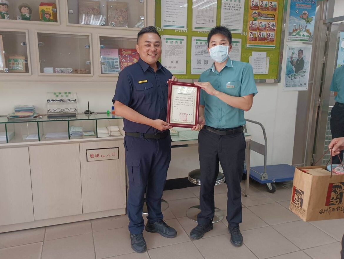 為感謝金寧郵局行員機警熱心、主動關懷提問並即時通報警方,共同攔阻詐騙義舉,金城分局分局長陳盈元特於本(8)月14日率偵查隊隊長及金寧分駐所所長親赴金寧郵局表揚行員,感謝經理及行員們對防詐工作的重視與辛勞,並協請持續辦理反詐騙工作。