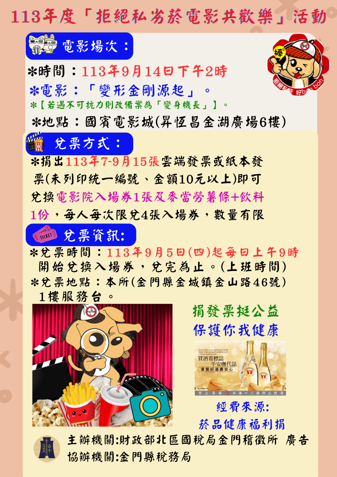 財政部北區國稅局金門稽徵所表示,為防制菸品稅捐逃漏,倡導民眾共同打擊非法之私(劣)菸,建立正確的納稅觀念,該所訂於113年9月14日(星期六)12時30分在昇恆昌廣場6樓【金湖鎮太湖路二段198號】辦理「拒絕私劣菸 電影共歡樂」防制菸品租稅宣導活動,並洽國賓電影城於14時播放強檔影片「變形金剛源起」,歡迎民眾兌換電影院入場券,攜家帶眷親子同樂。
