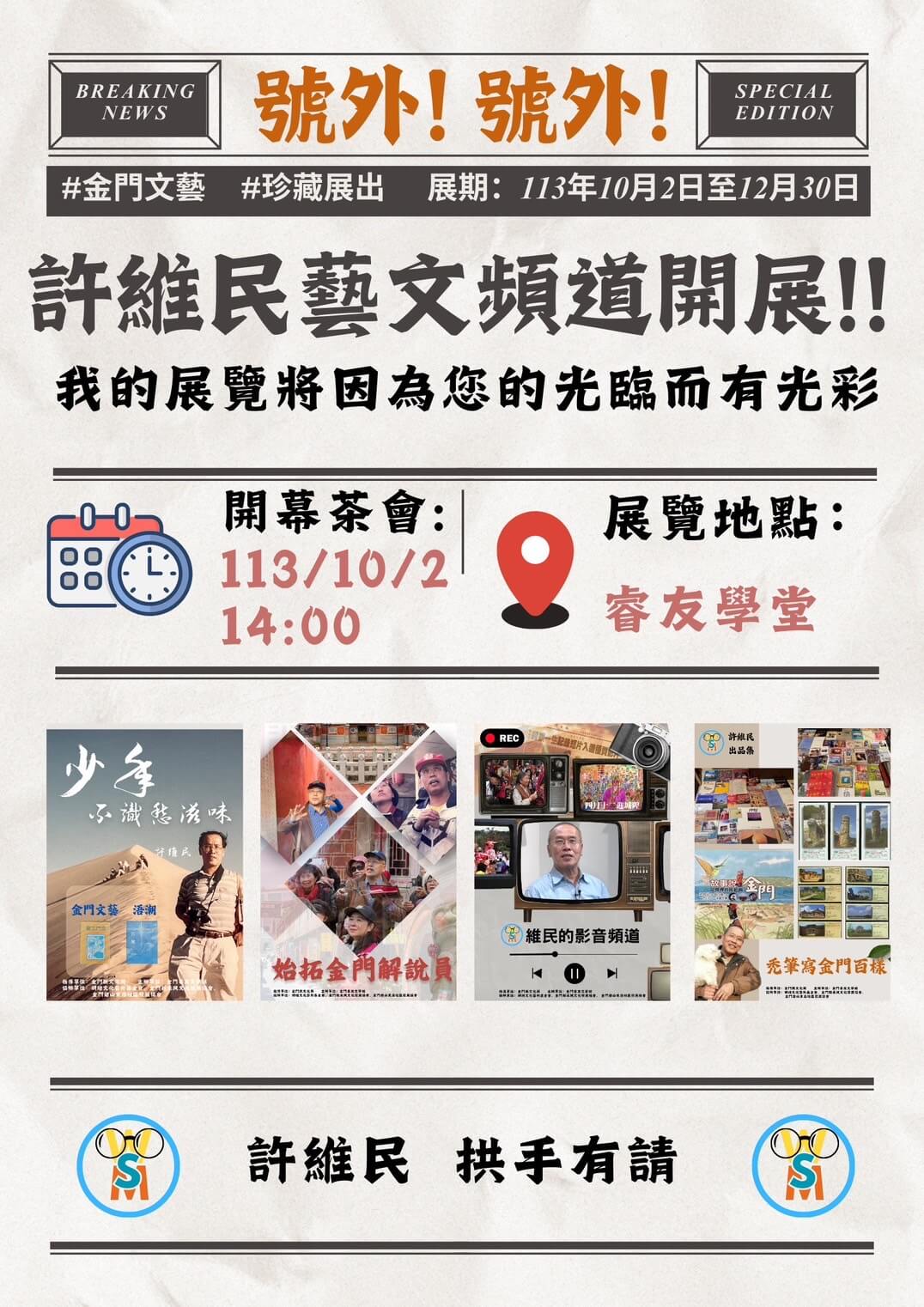 諸如個人的出版品,書籤卡片、賀年片,以及提供圖文資料受金門地區電信局、郵局、金門酒廠等機關,所設計的電話卡、月曆等系列化的展覽,可說是其個人完整的田調紀錄與成果。展期自113年10月2日起至113年12月28日止,歡迎鄉親及各界人士踴躍前往參觀。