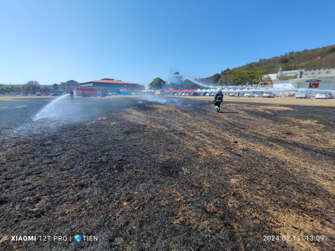 消防車組抵達後,發現現場大面積草皮已竄出濃煙及火舌,火勢迅速蔓延,情況一度相當危急。指揮官烈嶼分隊小隊長陳天傑立即指揮所屬佈署4條水線於下風處截斷火勢,以防止火勢擴大。火勢在強力水線攻擊及職義消通力合作之下,於12時54分即獲得控制,13時04分撲滅,並於13時22分殘火處理完畢,整起燃燒雜草面積約1,200平方公尺,無人命傷亡和財物損失情事。