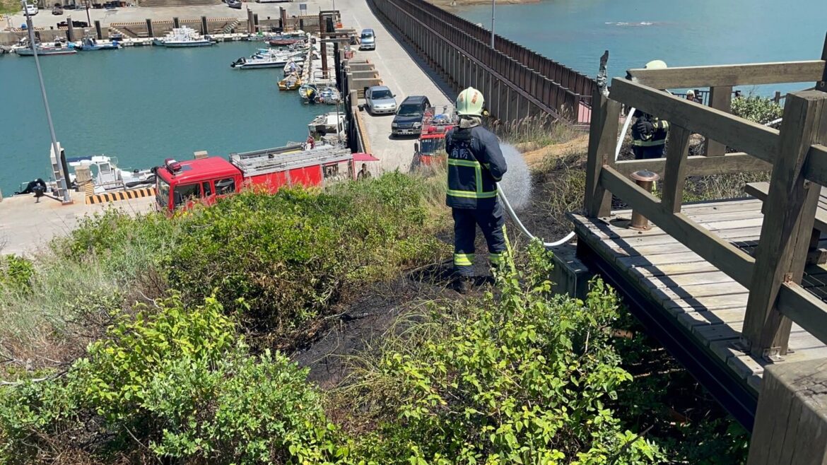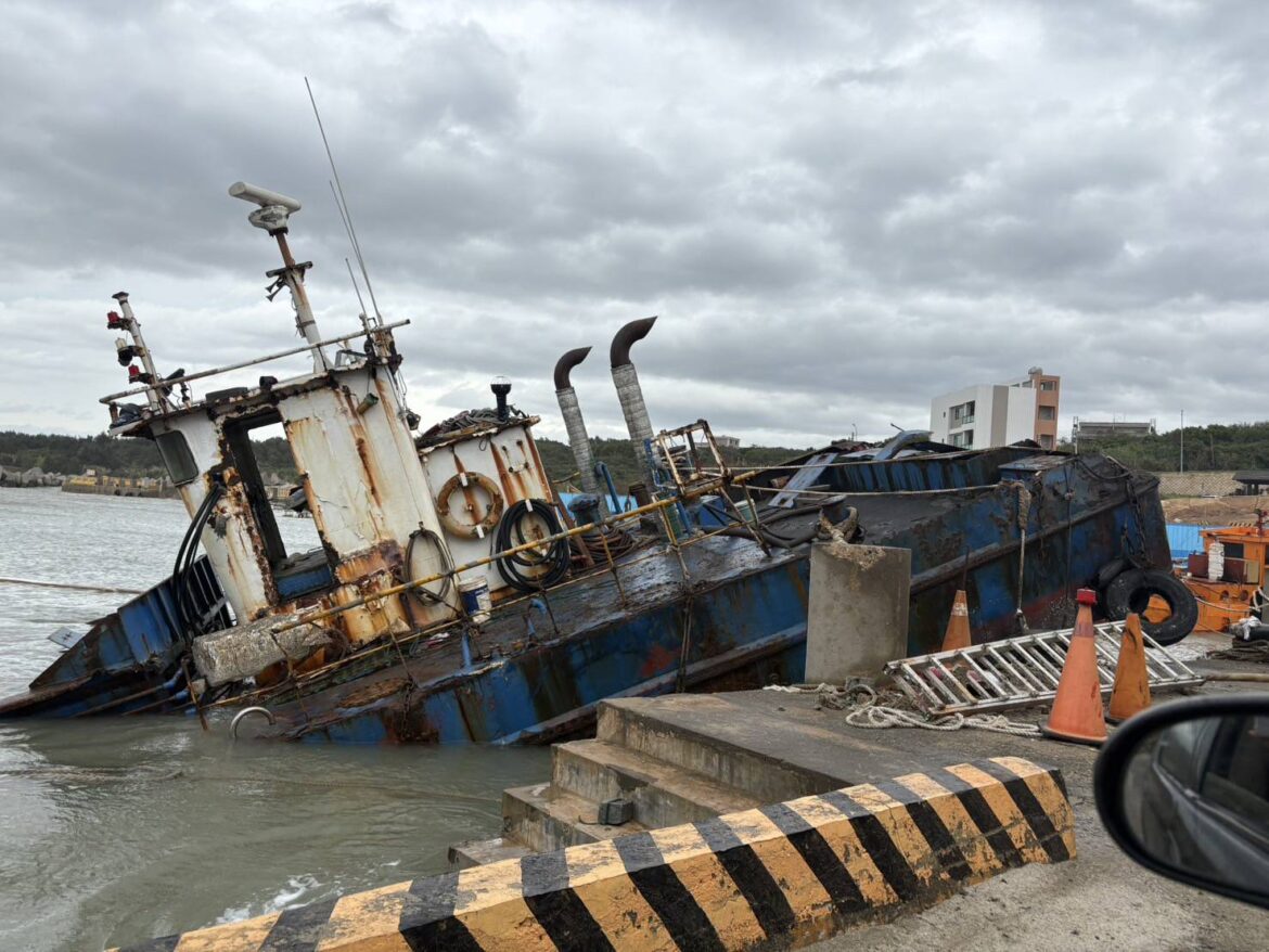 現場工作人員表示,這艘用來進行海上浚深工程的工作平台,原在日前就因船體有些微滲水,已先拖回復國墩漁港待檢修,沒想在颱風外圍環流所帶來的強風巨浪襲擊下,船體又撞擊到岸邊導致滲水情況更為嚴重,才使的船首沉入水中,但應無沉船之虞,目前先找來怪手綁繩牽引加強防撞措施,待颱風過後再由大型機具與拖船進行復原工作;也提醒民眾切勿靠近,以免發生危險。