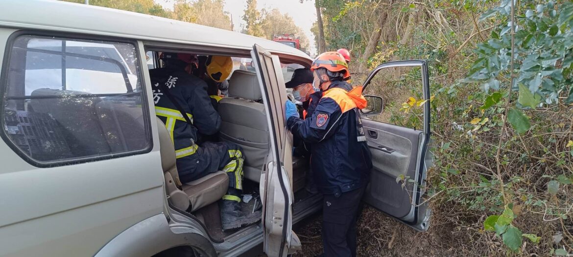 金門消防局金湖車組抵達車禍現場後,目視現場為兩輛自小客車發生擦撞,現場2位傷患,皆意識清楚,其中一位受困車內,指揮官金湖分隊小隊長李彪龍第一時間立即指派救助人員使用破壞器材協助受困民眾脫困,並進行急救措施後送由金湖91送往金門醫院,另一名則由金湖92協助送往金門醫院救治。