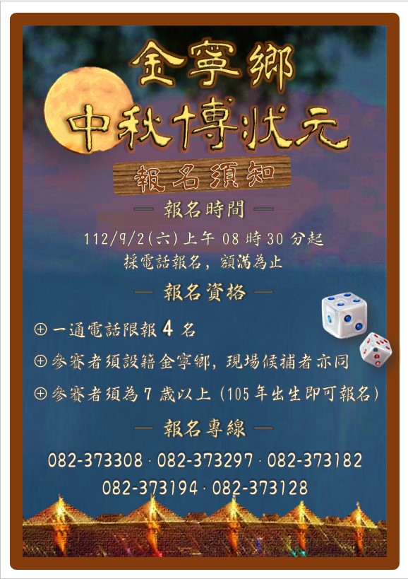 鄉長楊忠俊表示本次活動彩品豐富,將提供具地方代表性特產,作為各桌初賽彩品,總決賽「狀元王」彩品為125CC機車乙台以及廈門銀行贊助iPad乙台;「榜眼」為電視乙台;「探花」為掃地機器人乙台;第4名至第10名同列優勝,彩品為「5公升白罈金門高粱酒」各乙盒,機會難得,歡迎大家一起來慶中秋、搏手氣!另外,若中獎金額超過20,000元以上者,須依法扣繳10%機會中獎所得稅金,若中獎者不願意提供資料,或未能依法繳納稅額,即視為放棄得獎資格。(圖源自金寧鄉公所提供)
