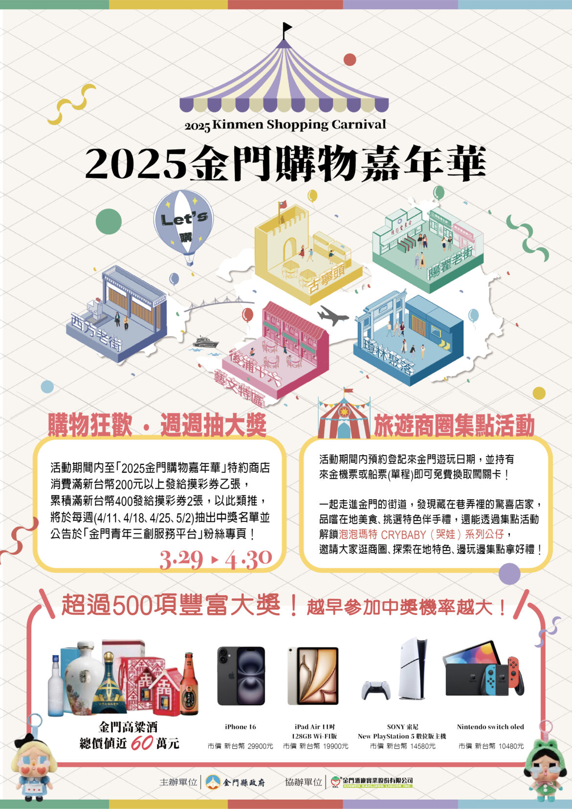 呂清福表示,金門縣長陳福海十分重視青年發展,致力推動相關政策,從幼兒教育、青年住宅到長者健康照護,期望營造更友善的生活環境,他進一步說明,購物嘉年華透過商家聯合推出優惠與摸彩活動,鼓勵在地消費,同時吸引外地旅客來金門,擴大經濟效益並創造更多商機與就業機會。本次嘉年華的重點活動之一為「購物滿額週週抽」,自3月29日至4月30日舉行,凡於特約商家單筆消費滿200元,即可獲得摸彩券一張,累積越多,中獎機會越大,活動獎品超過500項,包括金門酒廠提供的50L高粱酒等大獎,抽獎結果將於每週五公布。