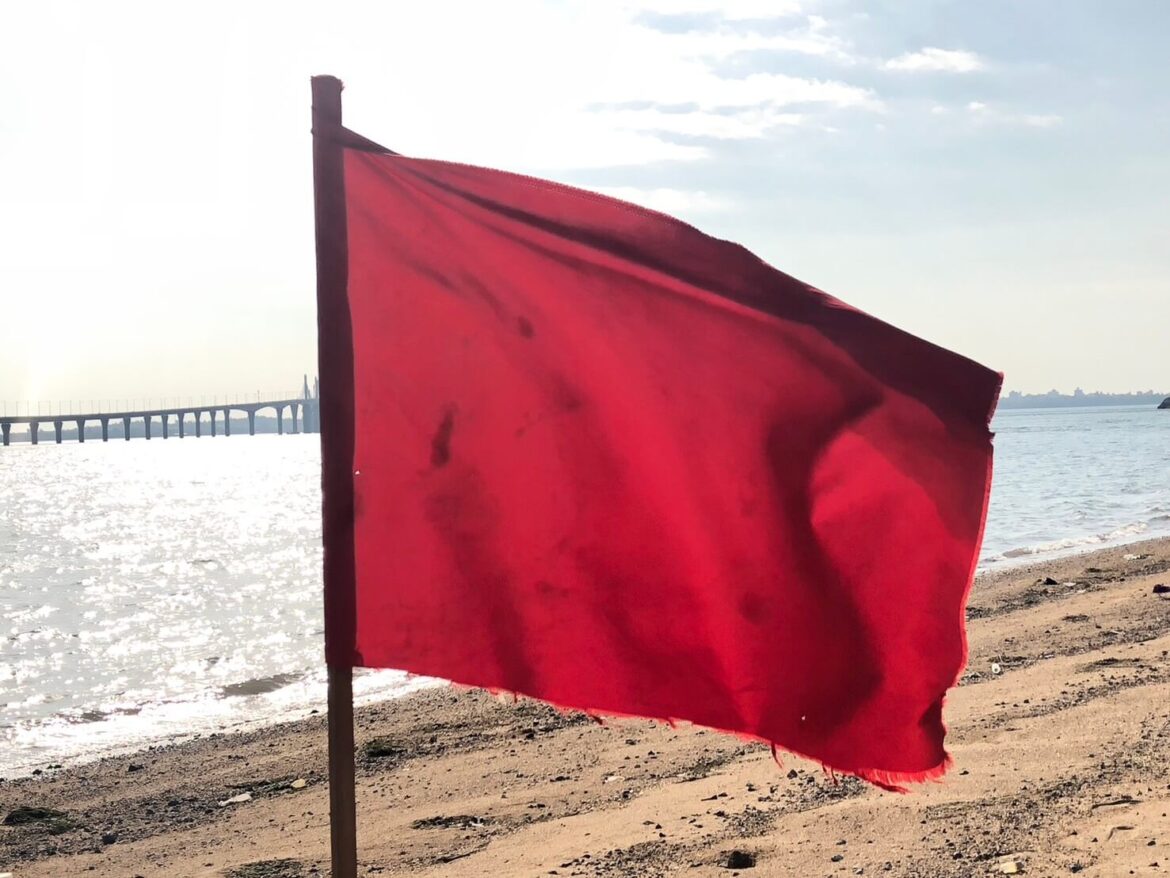 經查本案金門大橋烈嶼端下方兩側沙灘上各有純紅色旗1面,經與友軍單位確認,其係因近期演練需要而於岸際標示使用,並非民眾所稱五星旗。/圖金門海巡提供