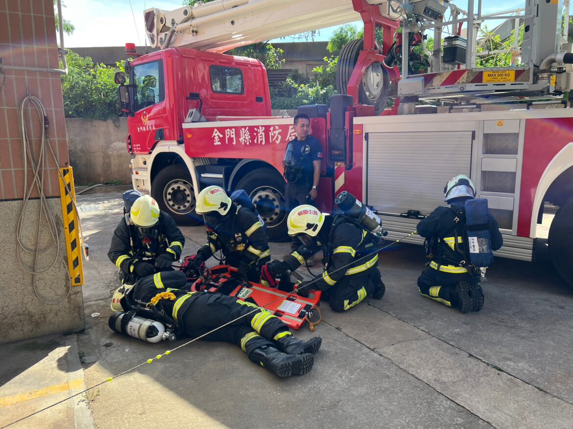 金門縣消防局2月29日上午9時在太武山百二階大岩壁上進行大隊組合訓練暨示範觀摩演練,為提高救援應變能力,與橫向單位金門國家公園管理處、陸軍金門防衛指揮部、保安警察第七總隊第四大隊金門分隊配合演練。總計出動車輛10車次,各單位人員合計30人次,成功展現單位間專業能力協作默契。