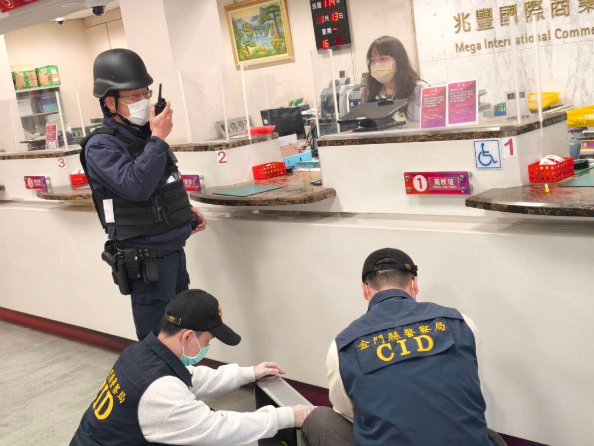 金城分局這項金融機構防搶圍捕演練13日下午4時0分假金城鎮民生路的「兆豐銀行」實施金融機構防搶圍捕演練,實施重點在模擬金融機構遭持槍歹徒搶劫的應變作為,強化員警熟練圍捕勤務,縮短報案時間、圍捕反應機制及展現員警平日訓練成效。13日模擬情況,警方以擬似真槍裝填塑膠火藥彈實施演練,槍聲大作,警車鳴笛實施圍捕,引起路人的圍觀,相當逼真。負責扮演歹徒的員警則是頭戴蒙面襪的歹徒,持槍和攜帶旅行袋衝進「兆豐銀行」,搶走新臺幣100萬元現鈔,過程中循小三通來金旅遊正在櫃檯換新臺幣之陸客也遭搶,警方接獲報案迅速派遣線上警力趕到現場,實施封鎖現場、攔截圍捕,最後警方在部署之攔截點,成功將2名搶匪緝獲。