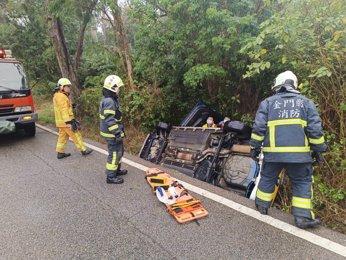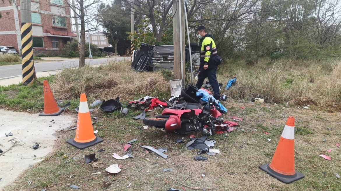 金城分局表示:金寧鄉林堡路前厝路段,於(24)日1時40分許發生一起交通事故,警方獲報後趕赴現場處理,發現一輛自小客車撞擊路旁空地上三輛普重機車及一輛電動自行車,自小客車強烈的撞擊造成停在空地上的機車碎片四散,現場一片狼藉,自小客車內遺留手機1具,但並未發現肇事駕駛,警方在現場採證相關跡證,後續將通知車主到案說明,以釐清肇事原因。終於早上10點多將駕駛尋找到案並偵訊畢,係何性男子,約年27, 於發生時地為閃避動物以致翻車。