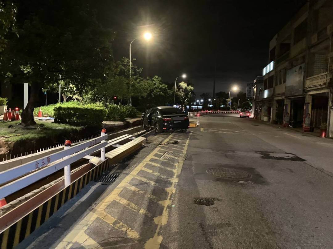 又見幽靈車!金門縣金城鎮民族路276號前路段,於今(4)日0時25分許發生一起交通事故,警方獲報後趕赴現場處理,發現一輛自小客車撞擊路旁施工警示牌,造成車頭毀損,警方趕到現場卻發現肇事駕駛不見了,/圖金城分局提供