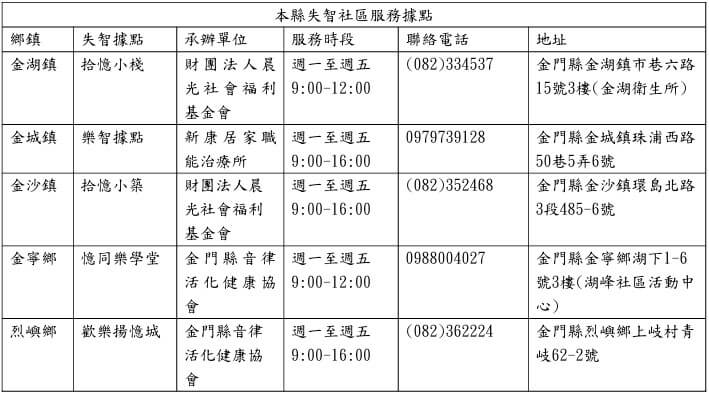 失智社區服務據點主要服務對象為疑似失智者及確診失智症者,服務項目包含: (1)認知促進、緩和失智課程。(2)照顧者支持團體。(3)照顧者照顧訓練課程。(4)共餐活動。(5)安全看視。(6)轉介疑似個案至共照中心。鄉親若有需要,請電洽各失智社區服務據點:金城鎮樂智據點0979-739128、金沙鎮拾憶小築082-352468、烈嶼鄉歡樂揚憶城據點082-362224、金寧鄉憶同樂學堂0988-004027、金湖鎮拾憶小站082-334537。若有相關問題可電洽衛生福利部金門醫院失智共同照護中心082-332546#11964或電洽長期照顧服務專線1966,將有專人提供相關資訊。