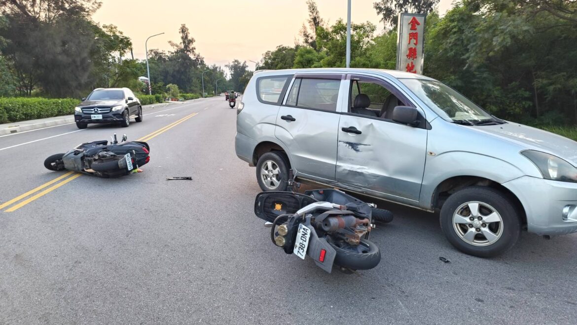 金寧鄉環島北路一段與仁堡路口於昨(10)日17時許發生一起交通事故,蔡姓男子駕駛自小客貨車沿環島北路一段由金城往金寧方向行駛,至該路口左轉仁堡路時,與對向沿環島北路一段往金城方向行駛,由謝姓及陳姓男子分別所騎乘之普重機車發生碰撞,事故造成謝男及陳男手腳多處擦挫傷,均由消防隊送部立金門醫院做進一步治療。金城分局於現場對三方駕駛實施酒測,皆未有飲酒情形,至於詳細肇事原因釐清中。
