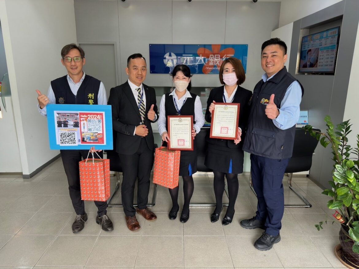 居住金門的A先生,透過LINE與暱稱Lydia加好友,雙方建立情誼後,Lydia遊說A先生投資普洱茶生意,並誆稱穩賺不賠,A先生遂於113年4月3日,到元大銀行金門分行欲匯款新台幣25萬2,000元至對方所提供之人頭帳號。元大銀行范姓及李姓行員關懷提問後,察覺A先生疑似遭詐騙,隨即通報金城分局金城派出所員警楊閎宇、黃紹魁趕赴現場處置,經警方、銀行共同確認查證後,並告知A先生此投資手法為詐騙集團慣用手段,才恍然大悟打消匯款念頭,並對警方及銀行防阻作為深表感激。 為感謝元大銀行行員機警熱心、主動關懷提問並即時通報警方,共同攔阻詐騙義舉,金城分局分局長陳盈元特於4月8日親赴元大銀行金門分行表揚行員,感謝經理吳介平及行員們對防詐工作的辛勞,並協請持續辦理反詐騙工作。