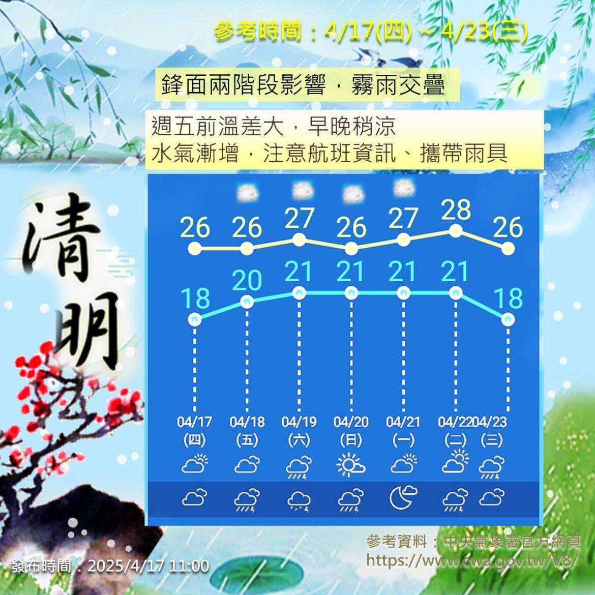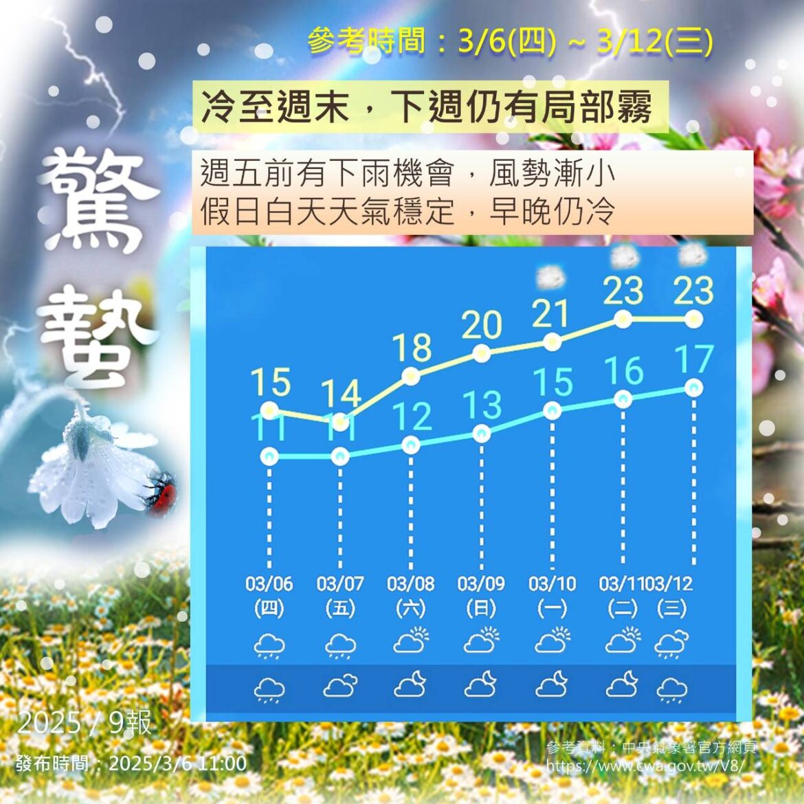 時序進入春季天氣變化快速,受冷氣團、雲雨區影響下天氣不穩定,未來有關霧及降雨訊息請持續關注氣象署所發布的天氣訊息。