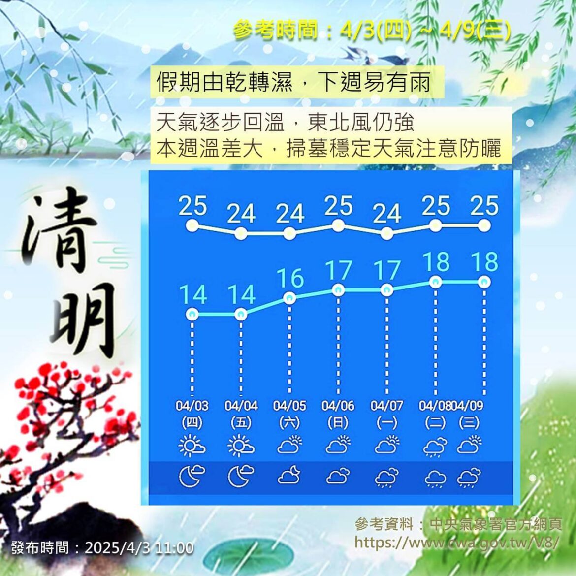本期前段仍不穩定,有短暫雨及低溫影響的機會,雖中後段逐漸回溫但溫差擴大,請隨時留意穿著。