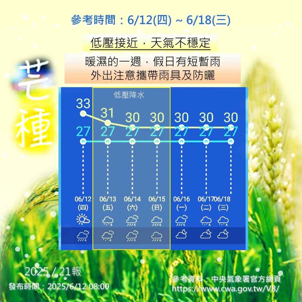 本期低壓或颱風外圍環流接近影響,易有強風及連續降雨的機會,週休假日期間易有雷陣雨,外出記得攜帶雨具,行車注意安全。