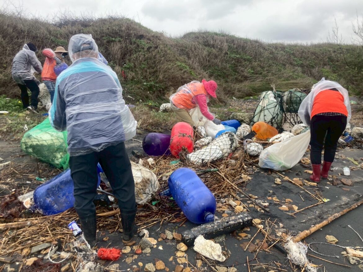 金門縣環境保護局於114年3月30日攜手五鄉鎮不畏風雨及低溫侵襲同步於金城鎮泗湖海灘、金寧鄉后湖海灘、金沙鎮后扁海灘、金湖鎮復國墩(狗嶼灣)海灘、烈嶼鄉黃厝仿雷區一帶海灘,舉辦一場淨灘的約會/圖金門縣政府提供