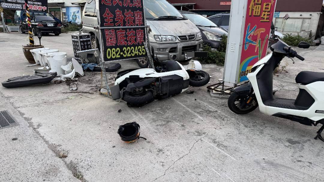 現場足浴桶被撞支離破碎,金城分局表示,汽機車迴車或轉彎前應暫停,並顯示右燈光或手勢,看清無來往車輛,並注意行人通過,始得轉彎;呼籲駕駛人,行經路口或路段欲轉彎時應確實遵守「慢、看、停」原則,注意禮讓並減速慢行,以避免事故發生。/圖葉建雄攝