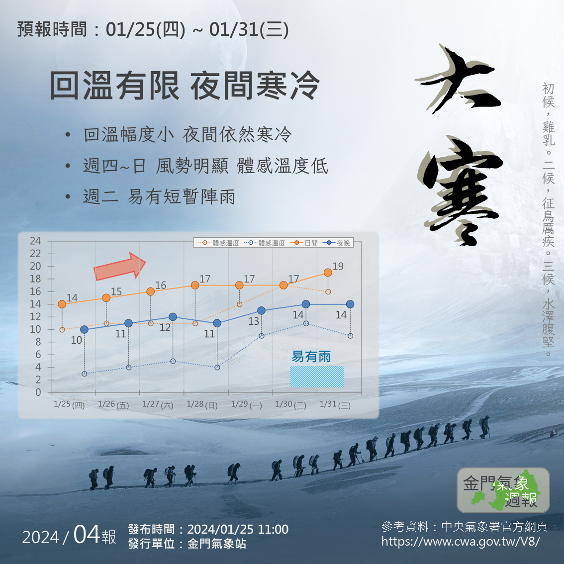 這波寒流最強的時間總算是過去了,但接下來的一週並沒有迎來大幅度的回暖。由於冷高壓的移出緩慢,所以週四~日(01/25~01/28)依然是被同一塊冷空氣影響,高壓的強度隨時間逐漸減弱,所以溫度有微幅的上升,因此這四天依然是相當寒冷的,尤其夜間的溫度都還是在10度左右,加上風勢增強,戶外體感溫度很不友善,請盡量避免夜間出門。