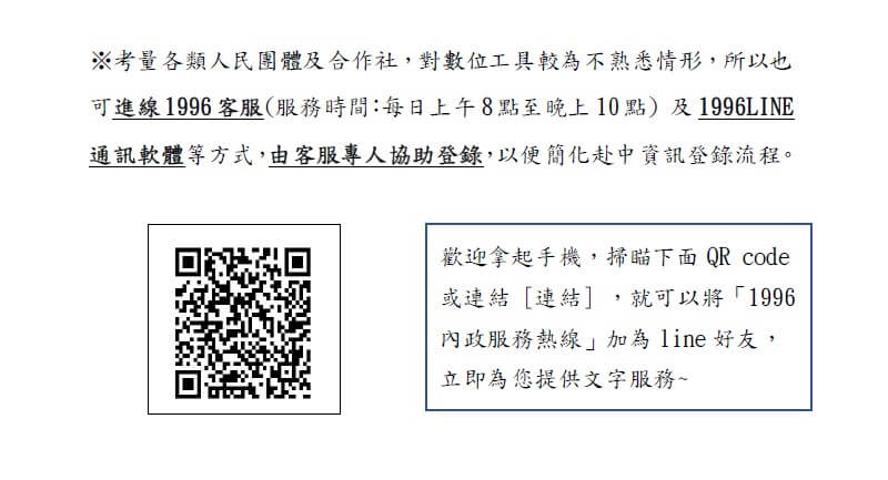 強化活動安全 宗教團體赴大陸交流需內政部登錄/圖金門縣政府提供 內政部考量各類人民團體及合作社,對數位工具較為不熟悉情形,所以也可進線1996客服(服務時間:每日上午8點至晚上10點)及1996LINE通訊軟體等方式,由客服專人協助登錄,以便簡化赴中資訊登錄流程。 |