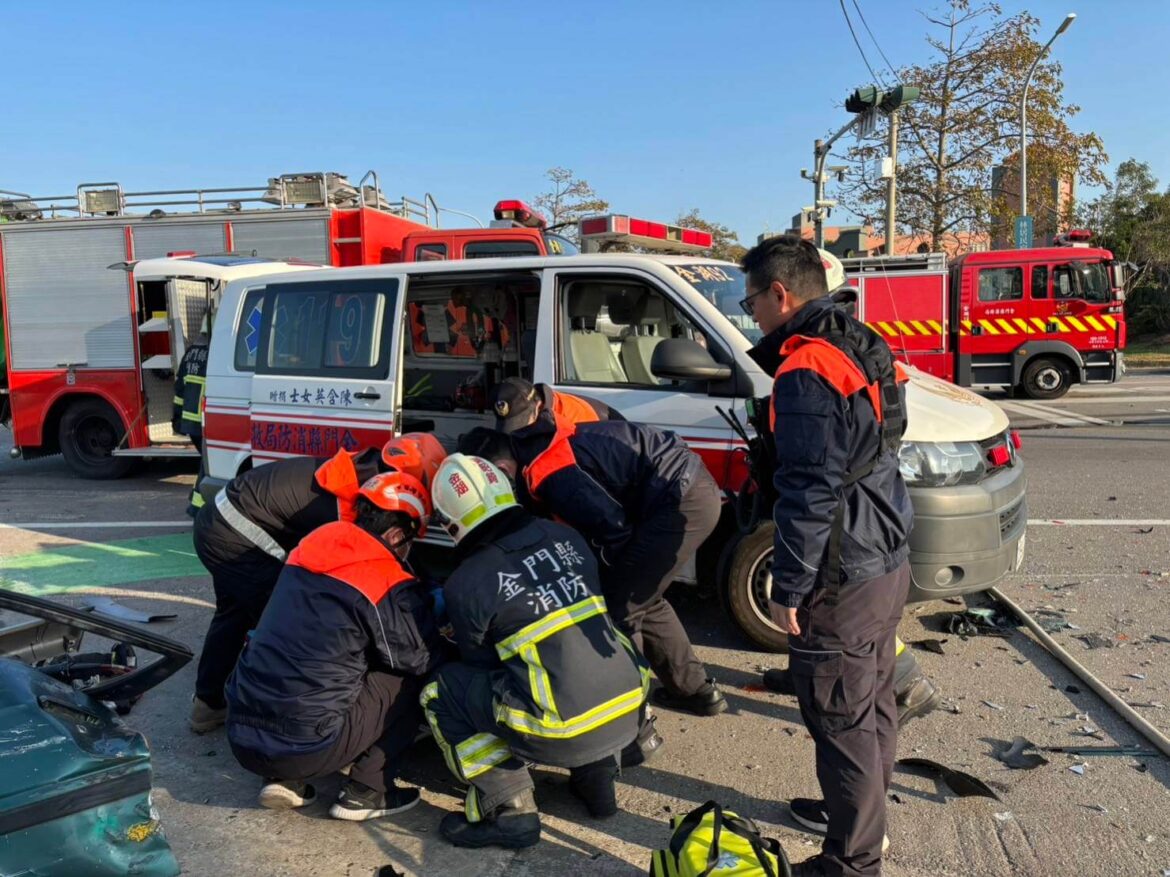 消防車組抵達現場為兩部自小客車發生撞擊事故,第二大隊副大隊長董紀瑋率隊抵達後迅速實施檢傷,確認現場傷患2名,後經救護人員評估後一名患者意識清楚,僅有肢體疼痛,指派救護人員先給予基礎生命徵象評估並持續給予心理支持。另一民眾因車輛變形而受困於駕駛座內,抵達初期消防同仁立即先以滅火器針對引擎室濃煙進行壓制,後續佈署水線從旁防護,以防突發事故應變之需;由小隊長蔡承霖組織破壞任務,運用油壓破壞器材及敲棒等,針對駕駛座變形車門進行破壞,營造適當空間,運用長背板等器具,迅速將患者救出,給予必要救護評估與處置,後送往金門醫院急救。