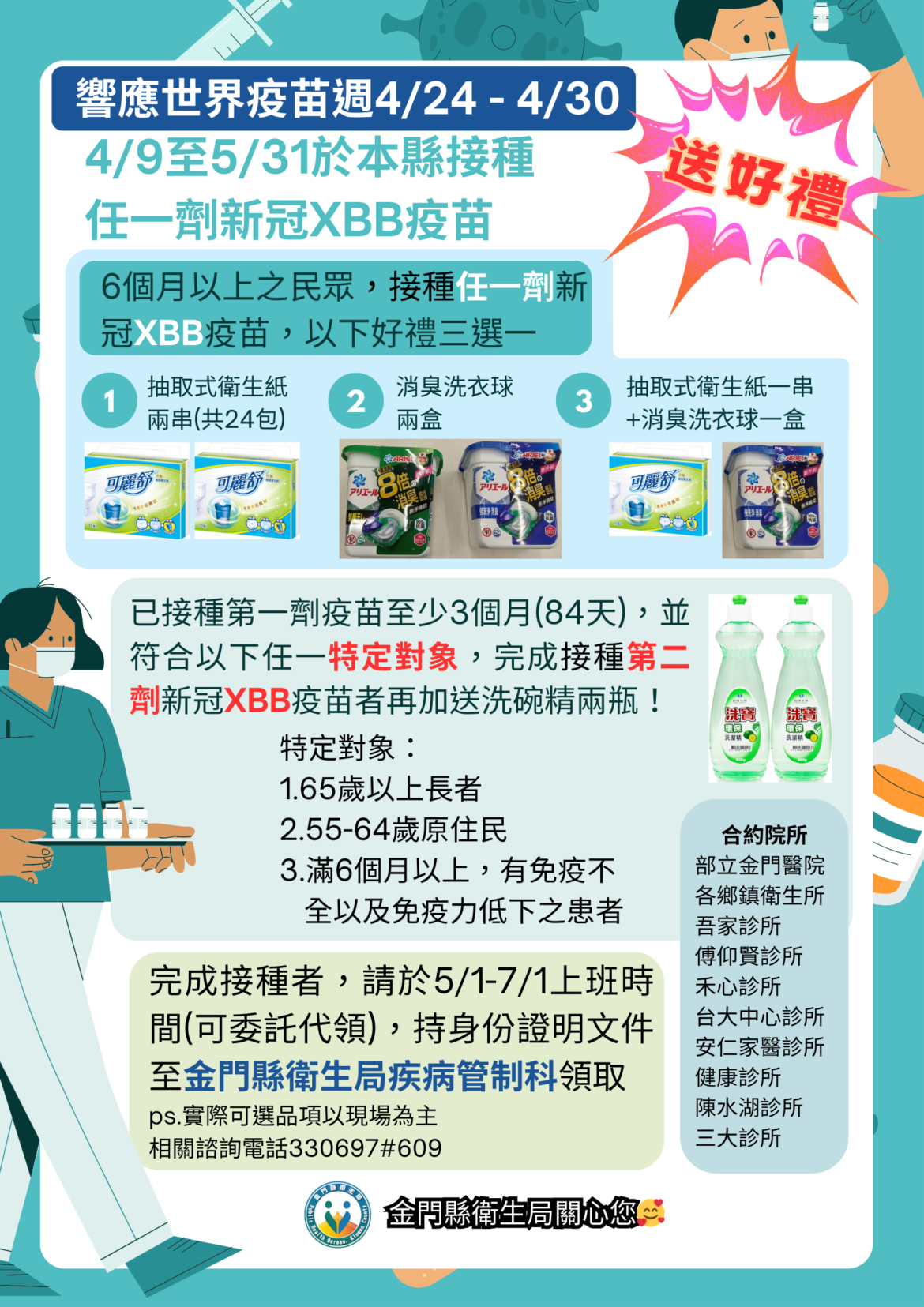 為響應「世界疫苗週」並提高鄉親新冠XBB疫苗接種率,於4月17日已於金門縣政府臉書發佈「打新冠XBB,好禮三選一」活動,衛生局並且透過金門日報刊登本活動廣告訊息,以加強宣導:提醒只要滿6個月以上之民眾,於4月9日至5月31日於本縣各合約院所接種任一劑新冠XBB疫苗,即可享好禮三選一;另,符合上述三類特定之高風險對象,若已接種第一劑疫苗至少3個月(84天),且完成第二劑新冠XBB疫苗接種者,再加送洗碗精兩瓶。該活動截至5月31日止,有關領獎時間為5月1日至7月1日,請至本縣衛生局疾病管制科或該局電話通知約定之地點領取,提醒鄉親多加留意並請好康逗相報,把握機會踴躍接種。 另,為維護學校整體免疫力,避免新冠疫情於校園傳播,繼而造成家庭群聚或社區感染,衛生局亦配合加強推動校園「新冠XBB.1.5疫苗接種作業」,已協調安排2次入校接種事宜。