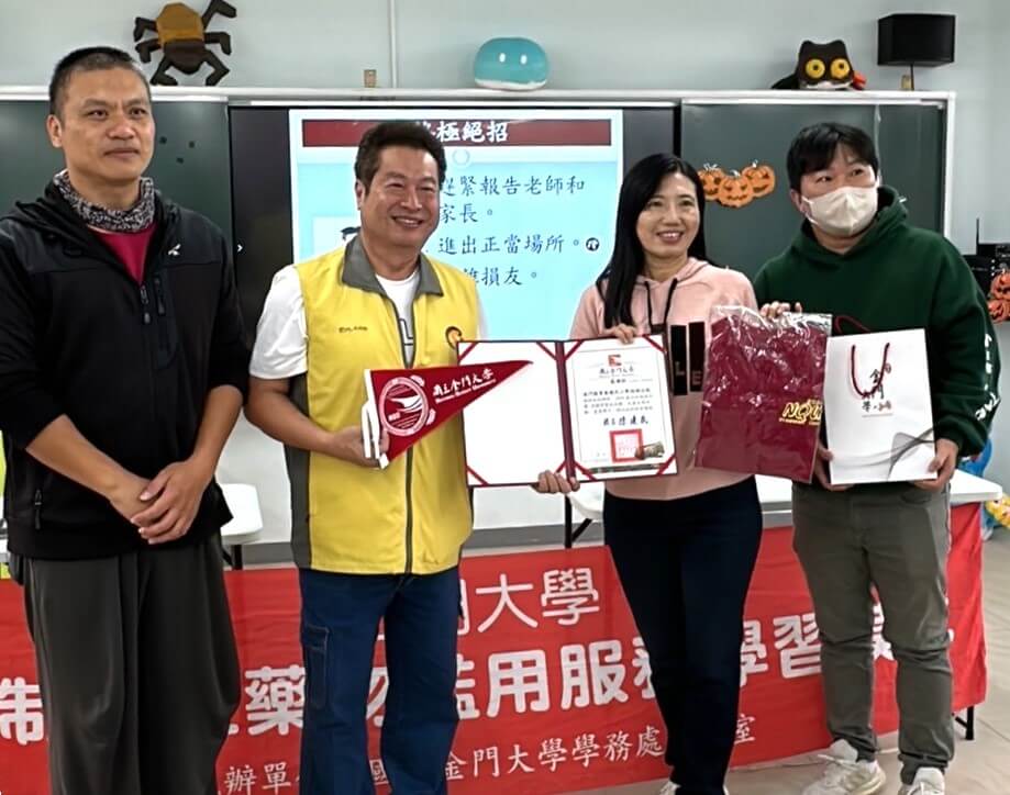 金大學務團隊以創新教學模式,在課堂中穿插角色扮演和案例討論,幫助學童理解吸毒的後果,並提升自我保護意識。學生志工也藉由自身榜樣作用,與學童建立信任關係,讓反毒觀念從小紮根於心。賢庵國小黃芸芸校長也特別感謝金大學務團隊的付出親自致贈感謝狀,金大也由學務長董燊教授代表學校致贈感謝狀謝謝賢庵國小校長黃芸芸團隊的共同合作。