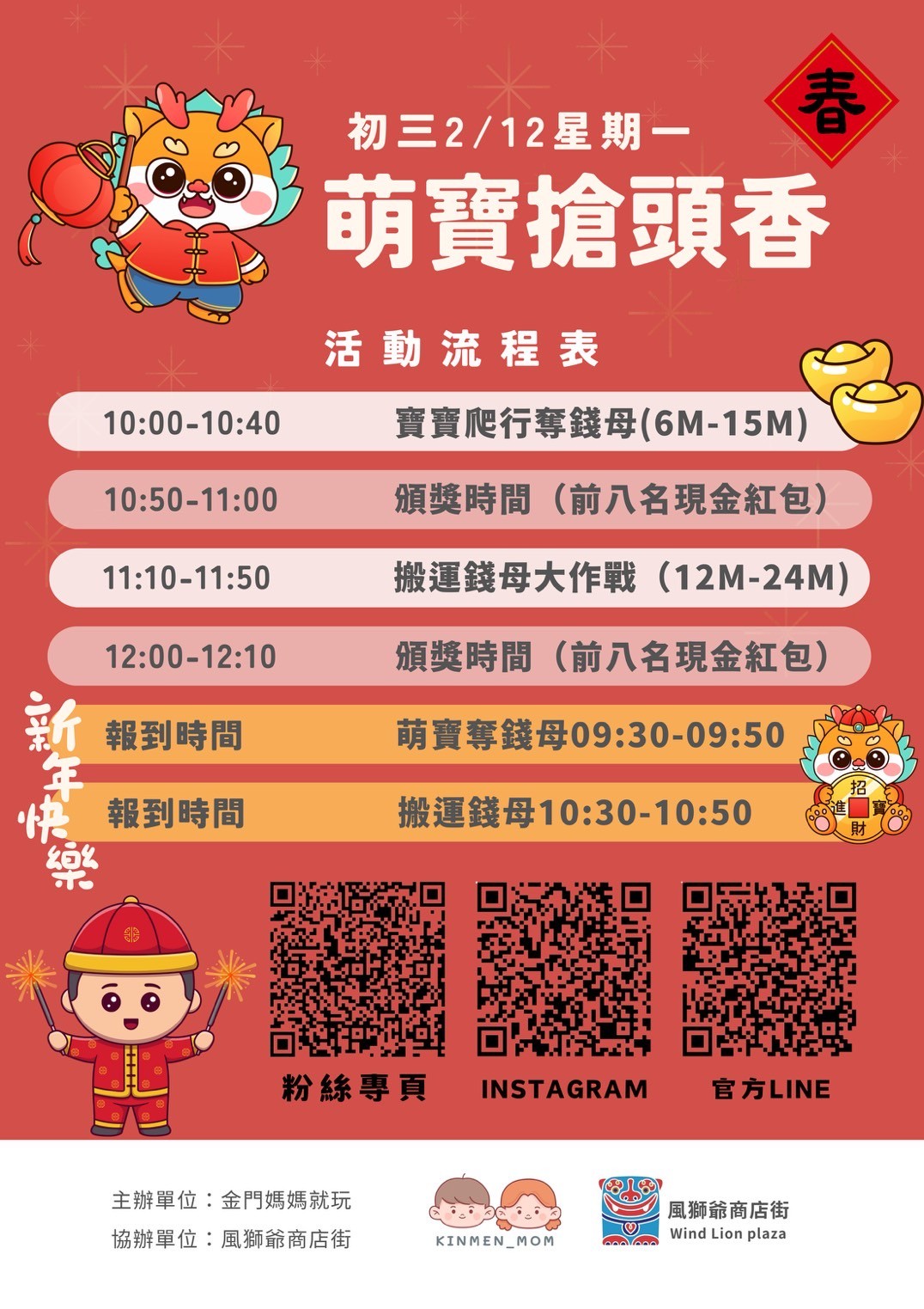 除了風獅爺福德祠求金儀式,於初一至初三(2024/2/10~2/12)期間籌辦「龍來逛市集」過年市集, 廣邀金門各小吃美食、童玩、文創商品、手作坊 DIY、手作蛋糕甜點、串燒等業者現場擺攤,藉由求發財金時聚集的人潮,讓參與的業者在新春開始就發財! 風獅爺福德祠除了求發財金及過年市集外,風獅爺商店街一樓邀請在地團體舉辦「元氣寶寶搶頭 香」寶寶爬行比賽與「瘋狂搶錢幣」寶寶搬搬樂比賽,增添寶寶萌樣的樂趣,前八名獲勝的寶寶還可把現金帶回家!