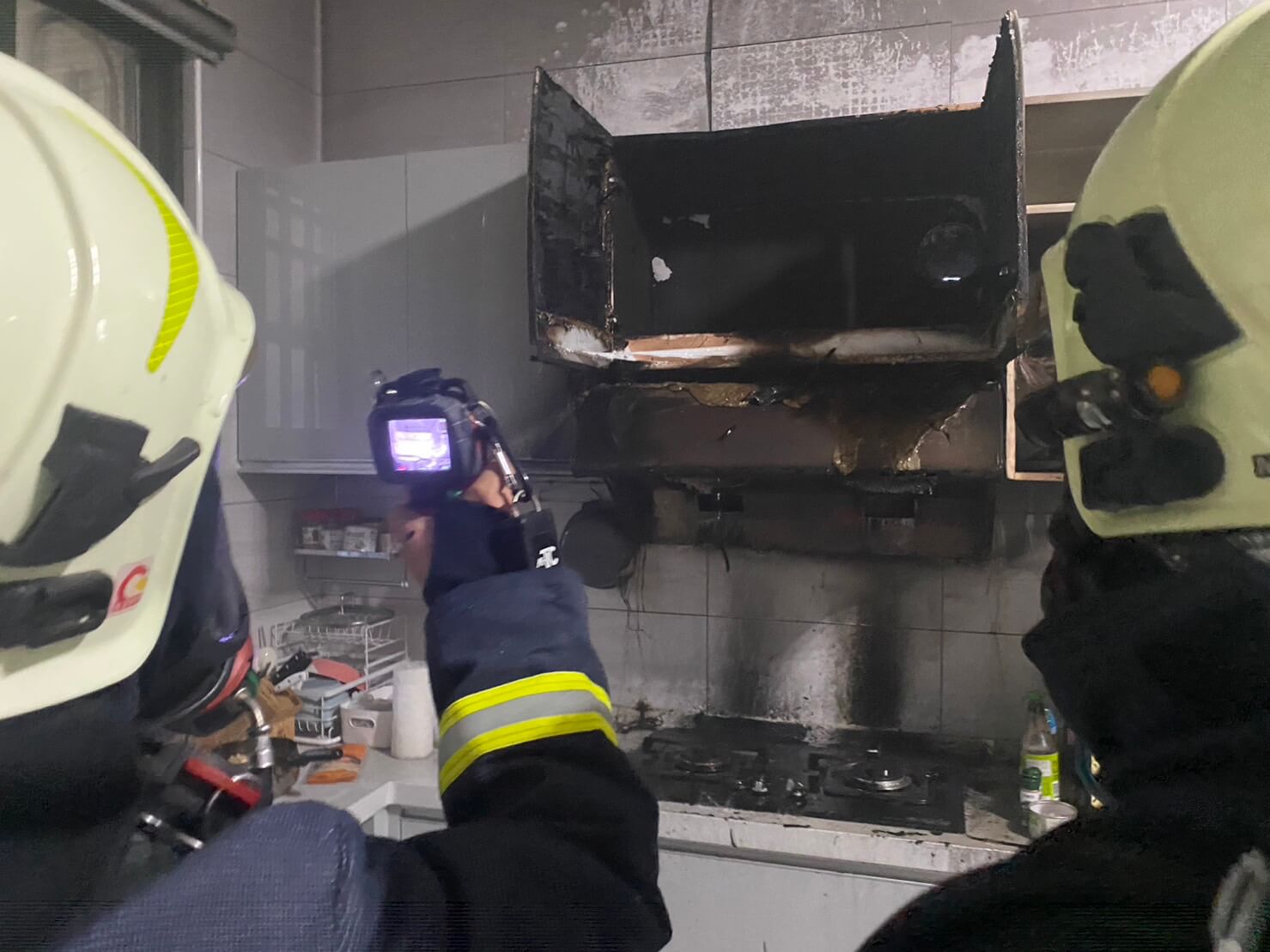 金門消防局勤務指揮中心獲報後立即派遣第二大隊共計7車13人前往搶救,義消劉登瑛、吳宏順等人聞訊也前往支援。車組抵達現場後發現民宅內有大量濃煙,屋內的住警器警也已鳴聲大作,現場已先由屋主進行初期滅火,火勢獲得控制,燃燒面積約1平方公尺,指揮官小隊長陳梓和指揮同仁協助通風排煙,並以TIC 紅外線熱顯像儀監控廚房排煙管溫度,經確認無復燃可能後始收拾裝備返隊。