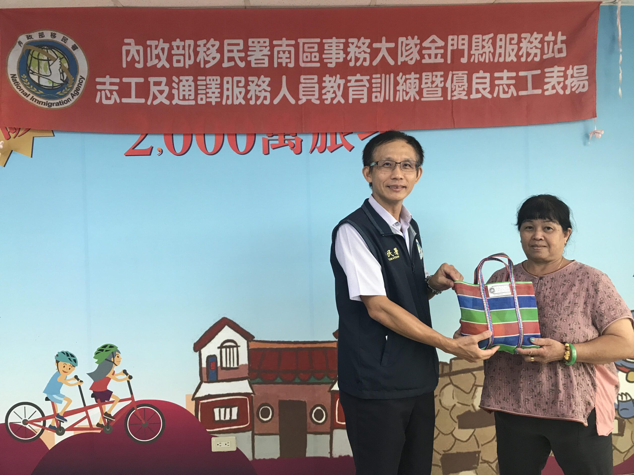 金門縣服務站主任致贈通譯洪梅蘭小禮物/圖移民署金門服務站提供