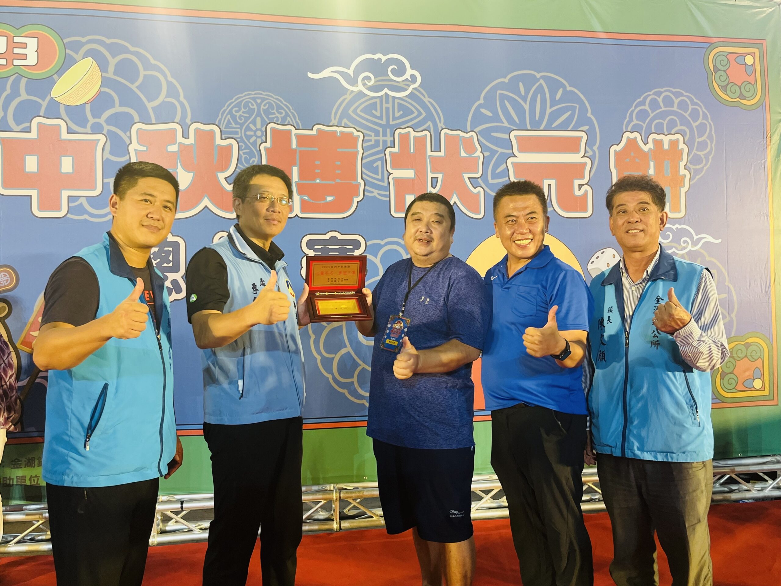 金門中秋博狀元餅系列活動「博餅總決賽」,9月24日晚上在金湖鎮新市里籃球場熱鬧開賽,莊佳泰勇奪狀元王寶座,由觀光處李銘培處長頒贈特製狀元金牌。