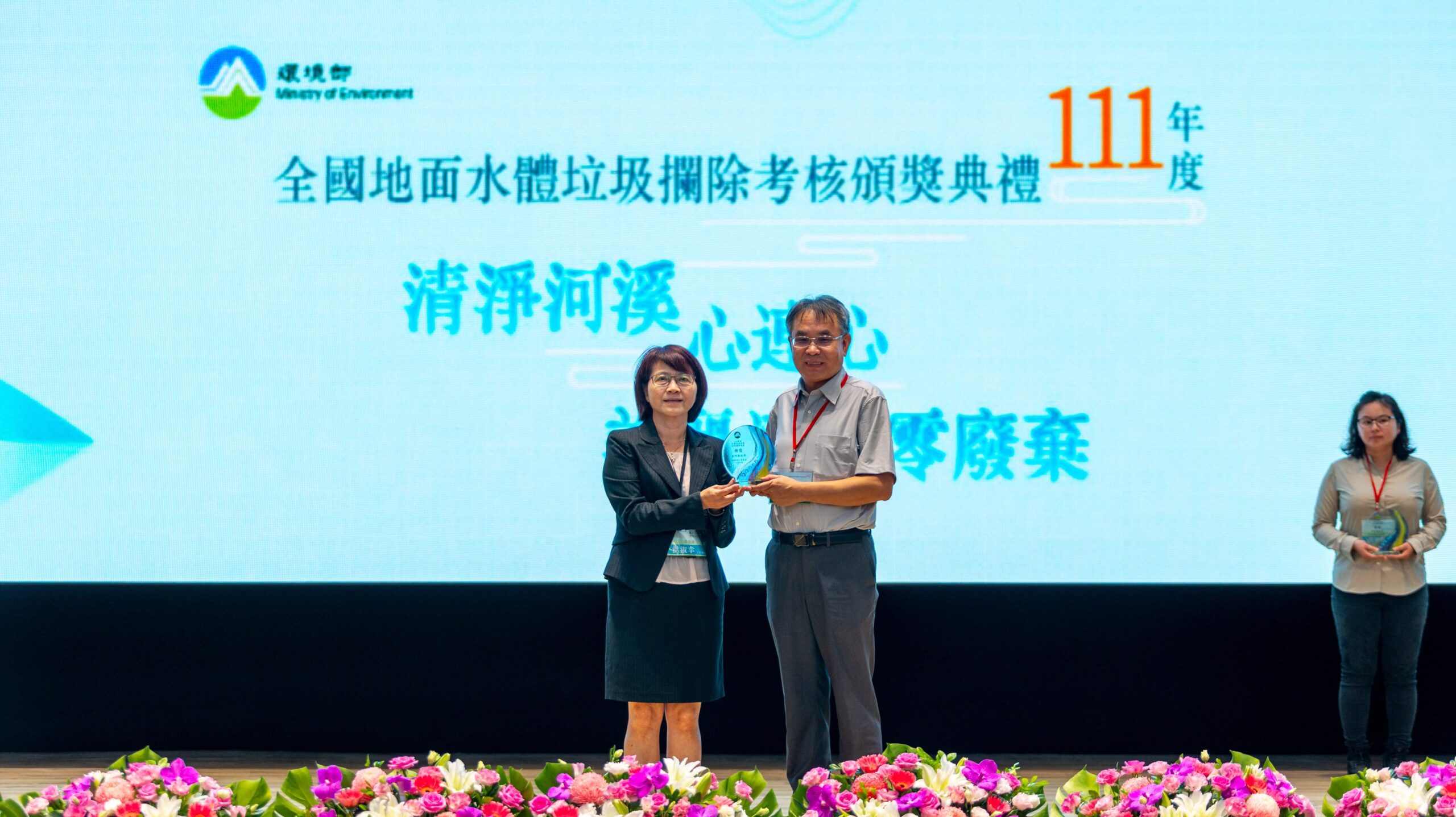 金門縣積極續推地面水體垃圾攔除工作,在縣府團隊努力下,榮獲環境部111年度全國地面水體垃圾攔除考核「特優」佳績,今(4)日環保局局長楊建立代表縣府接受環境部洪淑幸主任秘書於111年度全國地面水體垃圾攔除考核頒獎典禮中表揚。