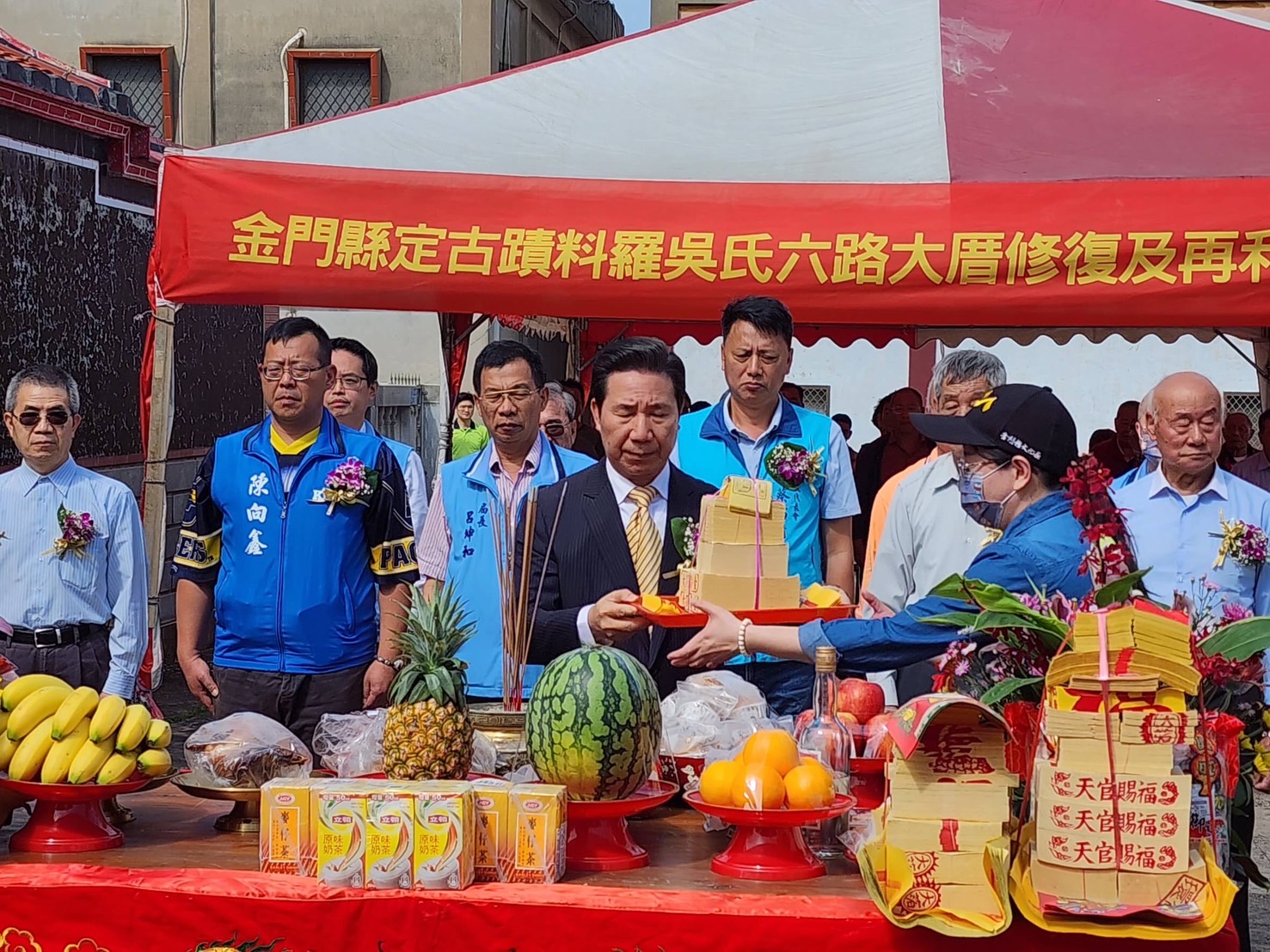 金門縣長陳福海率各界人士共同見證,(10)日舉行縣定古蹟料羅吳氏六路大厝修復工程的動土典禮,此次動土典禮由縣長陳福海主典官,金門縣各界代表齊聚一堂,共同祈求修復工程的平安順利。
