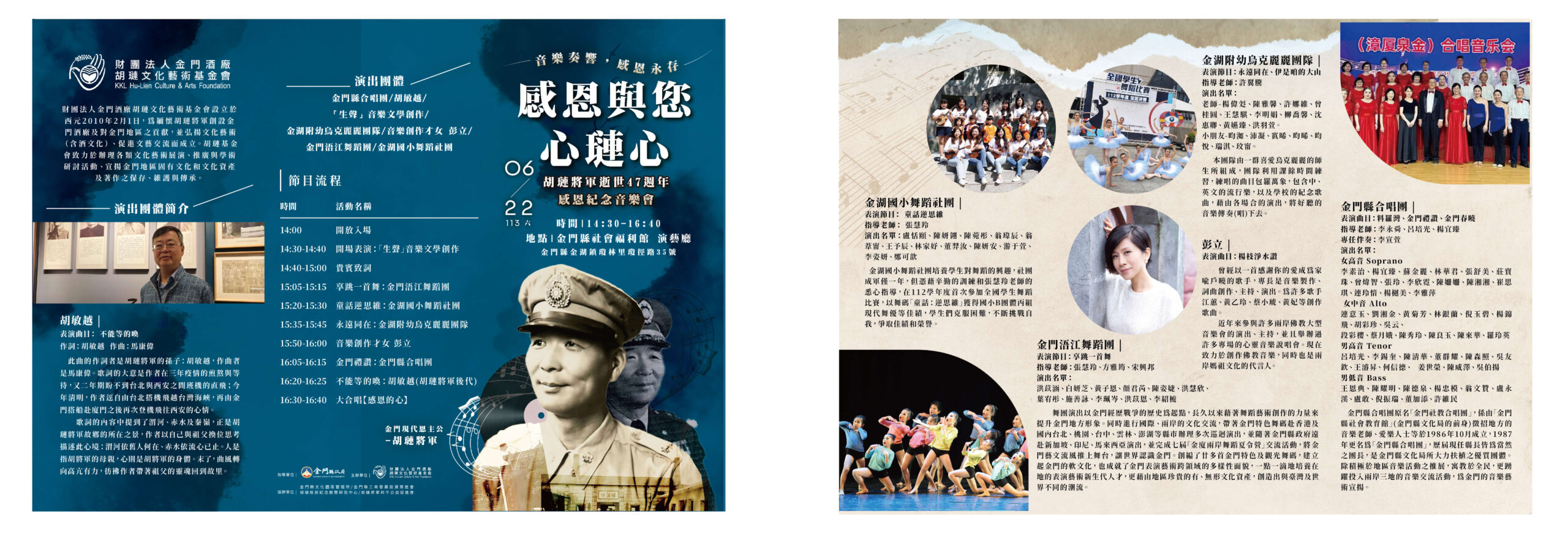 「感恩與您~心璉心」紀念音樂會,以藝術的形式傳遞金門人的情感與故事。這場活動不僅是對胡璉將軍的緬懷,更是對金門歷史與文化的致敬,為觀眾帶來一場視聽盛宴。基金會為讓鄉請感受與感恩胡璉將軍對金門的貢獻,在活動中,特別提供已絕版的胡璉將軍紀念酒作為模彩活動的獎品,誠摯邀請鄉親蒞臨這場意義非凡的音樂會,讓我們用音樂與舞蹈,向胡璉將軍致敬,向金門的繁榮與發展致敬。活動詳情或索票歡迎洽詢082-325628 轉88492,與胡璉文化藝術基金會聯絡。
