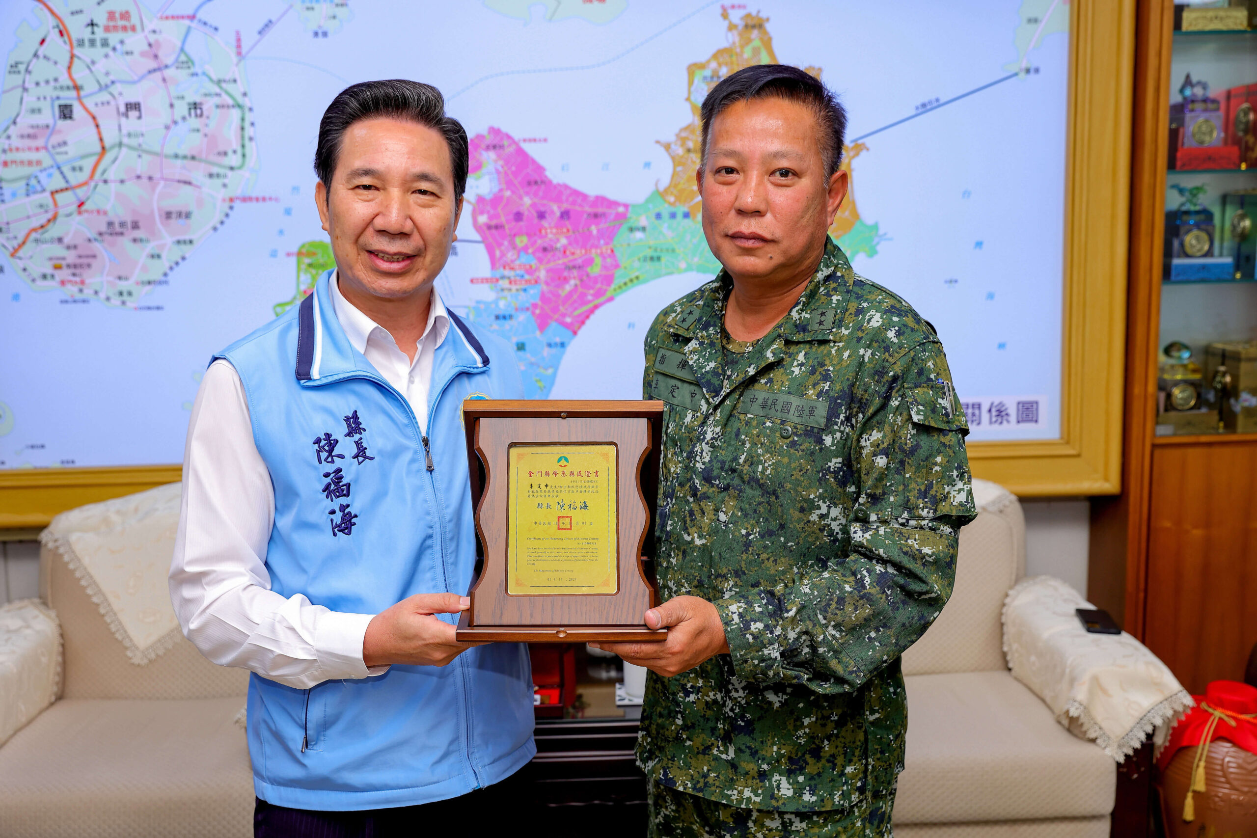 金門縣長陳福海於5日會晤榮陞為國防部陸軍副參謀總長的金門防衛指揮部前指揮官李定中中將,與新上任金防部指揮官黃先任中將、政戰主任鄭傑元一同拜會縣長陳福海。陳縣長特頒贈「榮譽縣民證」予李中將,感謝其對金門的投入與貢獻,並期望未來與黃指揮官繼續實踐軍民一家親,保持良好合作與互動關係。