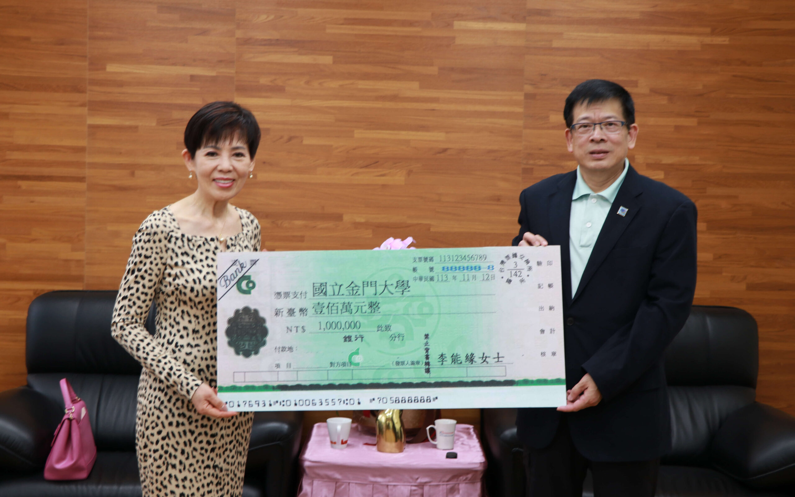 金門籍傑出旅台鄉親李能緣繼105年捐贈國立金門大學200萬元成立「李能緣女士清寒獎助學金」之後,日前又再度捐贈100萬元充實清寒獎助學金,以幫助更多經濟困難的學子安心就學,並在金門大學的優質學習環境中勇敢追逐夢想。/圖金大提供