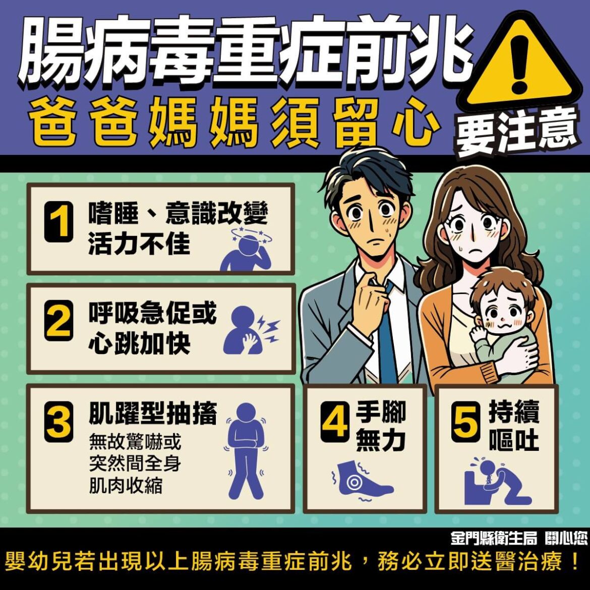 金門衛生局再次呼籲,個案在發病後一週內傳染力最高,無論成人、幼兒,都有感染腸病毒的可能;成人外出或工作返家後,應先更衣再摟抱幼兒,孕婦、新生兒及幼童盡量避免與病患接觸,降低病毒傳播的機會; 5歲以下嬰幼兒為腸病毒重症高危險群,如發現有嗜睡、意識不清、活力不佳、手腳無力或麻痺、肌抽躍(無故驚嚇或突然間全身肌肉收縮)、持續嘔吐與呼吸急促或心跳加快等腸病毒重症前兆病徵,應儘速送到醫院接受診治。相關資訊可至疾病管制署全球資訊網(https://www.cdc.gov.tw),或撥打免付費防疫專線1922(或0800-001922)洽詢。