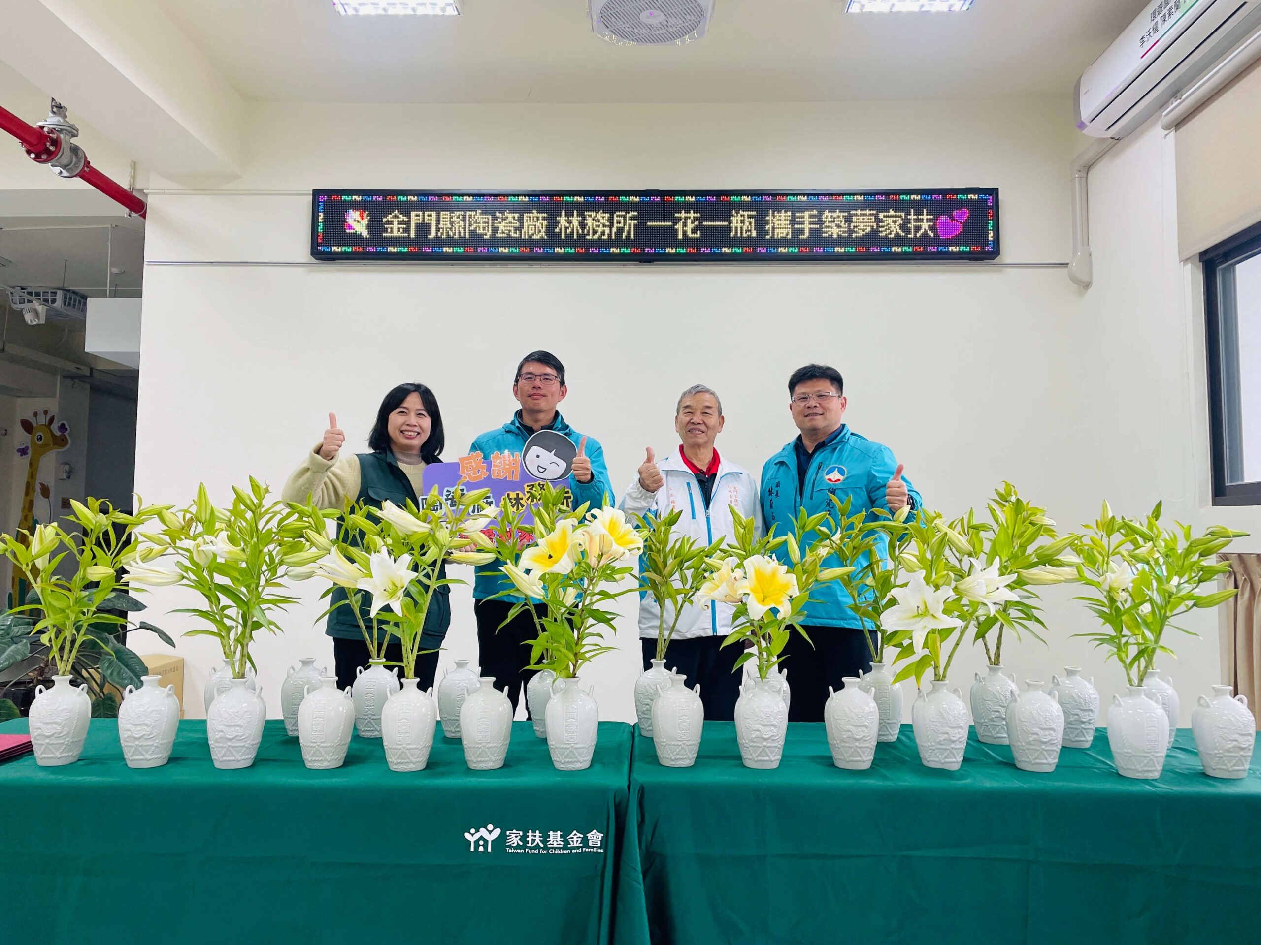 金門縣陶瓷廠及金門縣林務所攜手發起「一花一瓶,築夢家扶」公益活動,由金門縣陶瓷廠廠長林蔚尚及金門縣林務所所長鄭向廷共同將百合花束及陶瓷瓶送到金門家扶,並親自將500組富有意義的百合花瓶組贈送給指定捐款「獎助學金」專款的民眾,感謝鄉親用實際行動傳遞愛與希望。活動現場由家扶中心主委楊肅謙、洪依帆代表贈送感謝狀給林務所及陶瓷廠,表達誠摯的感謝之意。
