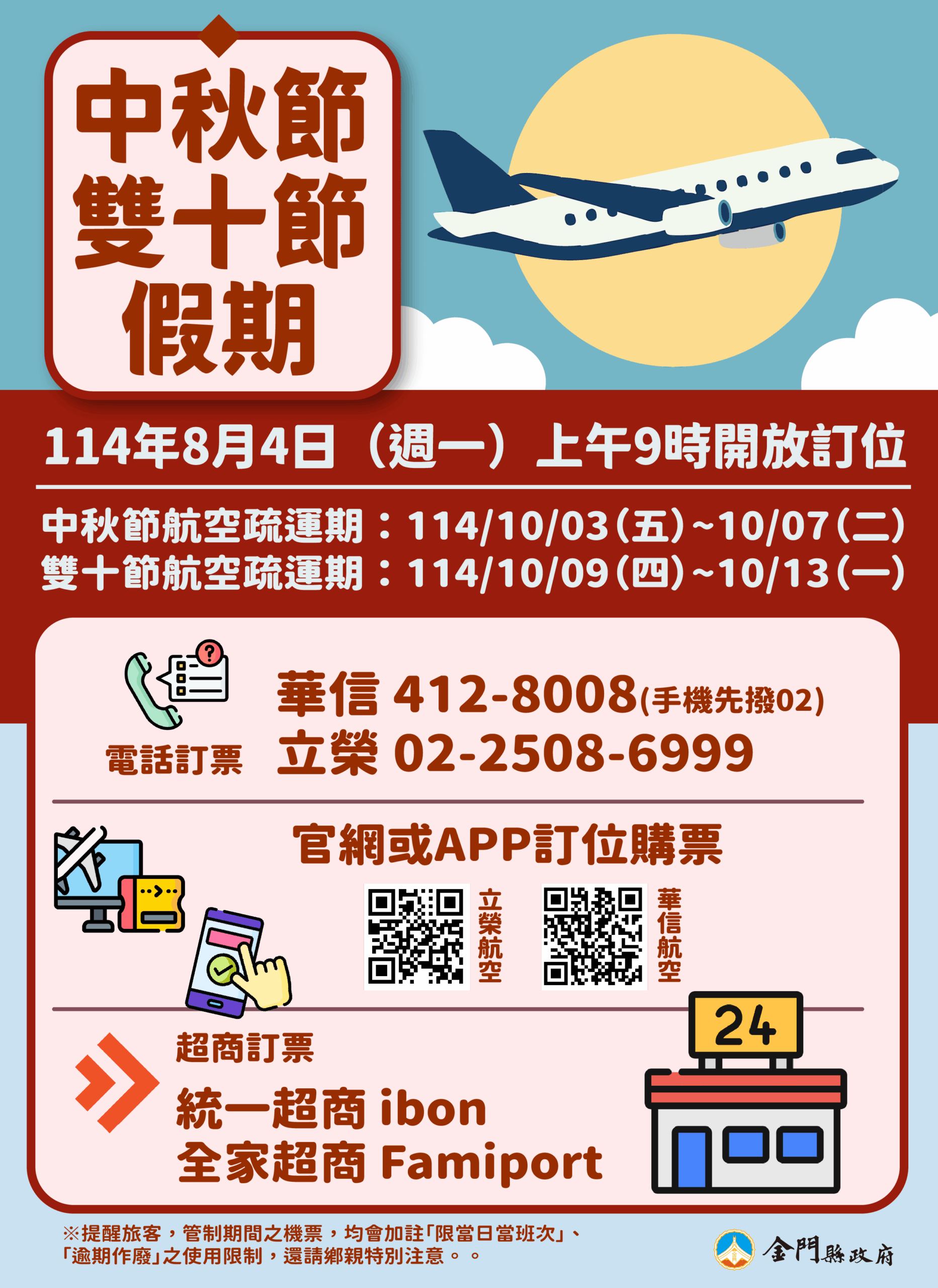「中秋及雙十節連假臺金機票 8/4(一)上午9時開放訂位」/圖金門縣政府提供