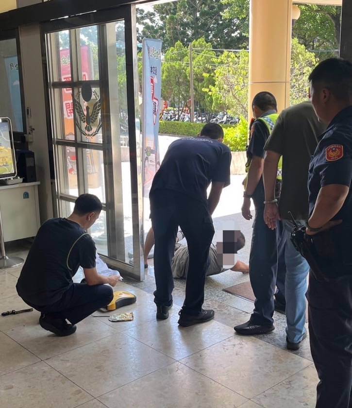 王男剛至派出所門口即倒臥地上,右手一直捶著心臟部位,且面色鐵青神情十分痛苦難受,值班警員謝秉修見狀立刻撥打119請救護車到場,並準備派出所配置之AED在旁待命,幸而王男意識清楚,且救護車迅速到場將王男送醫,避免憾事發生。